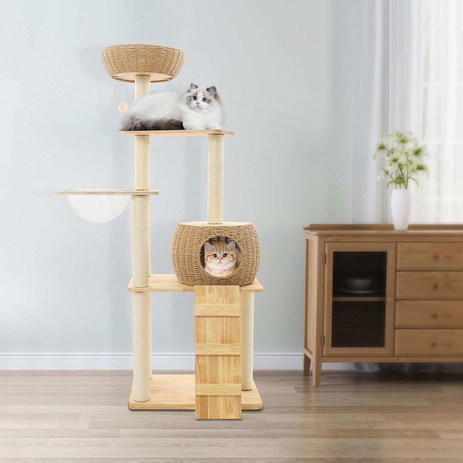 - Cat Entertainment: The natural sisal-wrapped poles, cat teaser ball, and space capsule allow your cat to do exercises like climbing up and down, playing, rubbing its paws, or resting so your cat can be healthier and happier